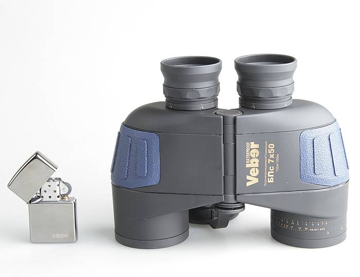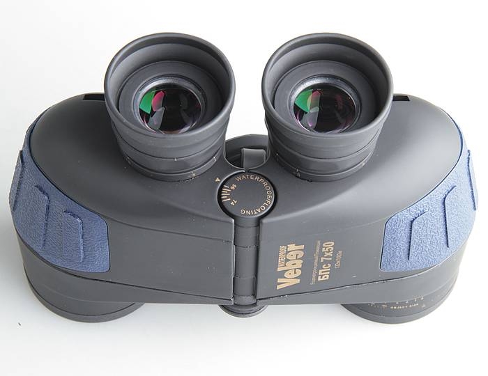 Морской бинокль не должен иметь большое увеличение. Большое увеличение – это маленький угол обзора и при качке и тряске трудно удерживать объект в поле зрения. Такой бинокль должен быть светосильным для наблюдения в сумерках, быть водозащищенным, не запотевать (быть азотонаполненным), не должен скользить в руках. Veber WaterProof 7x50 - это НАСТОЯЩИЙ МОРСКОЙ БИНОКЛЬ. Еще он имеет дальномерную сетку для определения расстояний. Уникальность Veber WaterProof 7x50 – в его способности удерживаться на поверхности воды. Сверхпрочный, но тонкий поликарбонатный корпус с большим объемом внутри, несмотря на солидный вес оптических стеклянных элементов, не позволяет биноклю утонуть.